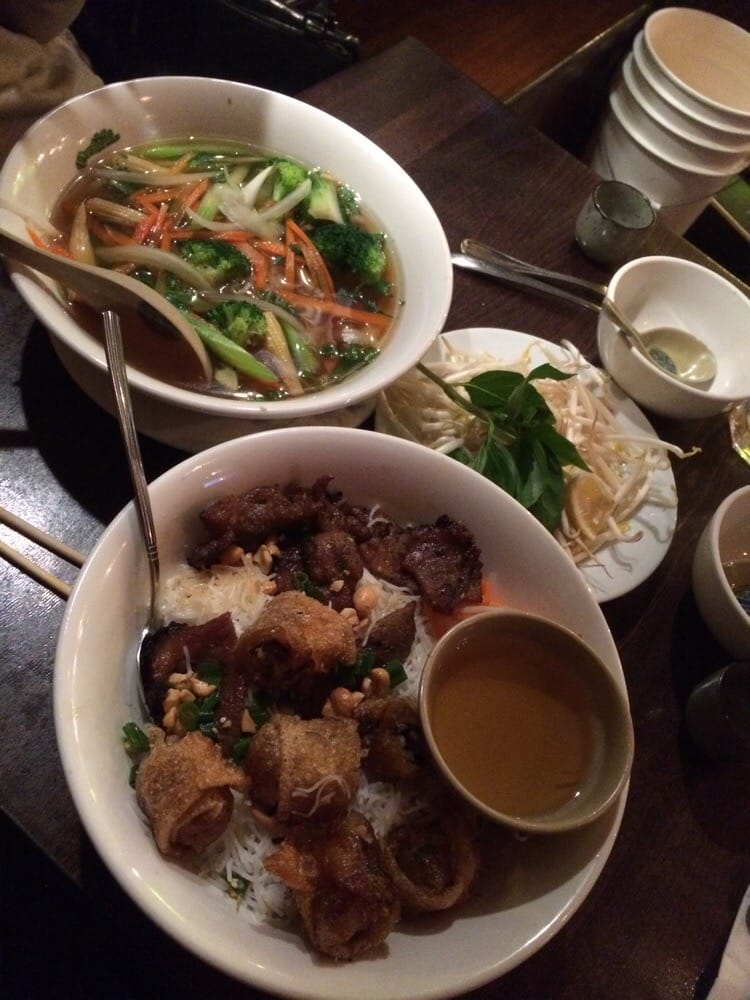 Bun xao chay.Mixed vegetable and tofu stir fried in a traditional Vietnamese sauce and served on vermicelli with peanuts and orange sauce.