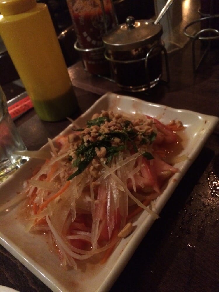 Fresh pounded papaya, carrot, roasted peanut, tomatoes and fresh lime dressing. Hot and spicy.